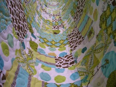 with the busy-ness of the fabric print, it just needed an E2E so i did my signature cotton candy allover with a white thread. it adds a nice texture to the quilt....i luv texture