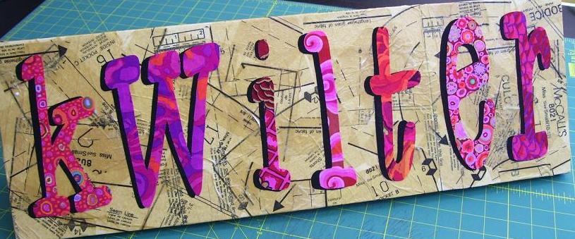 i made two sets of letters; one black and the other scrappy Fassett pinks. i used Microsoft Word to print out the letters. then i put a layer of ModPodge and carefully stuck them down.